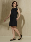 Платье с о съемным цветком выполнено из смесовой ткани, состоящей из 70% льна и 30% хлопка.